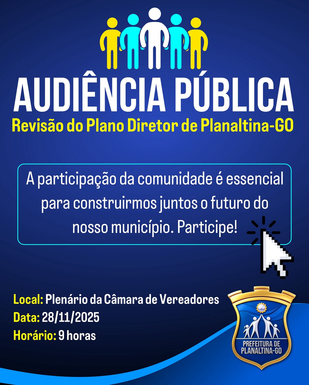 A Prefeitura Municipal de Planaltina de Goiás convida toda a comunidade para participar da Audiência Pública de Revisão do Plano Diretor Municipal. Este é um momento fundamental para que a população contribua com ideias, sugestões e visões que irão orientar o desenvolvimento urbano e social do município nos próximos anos.