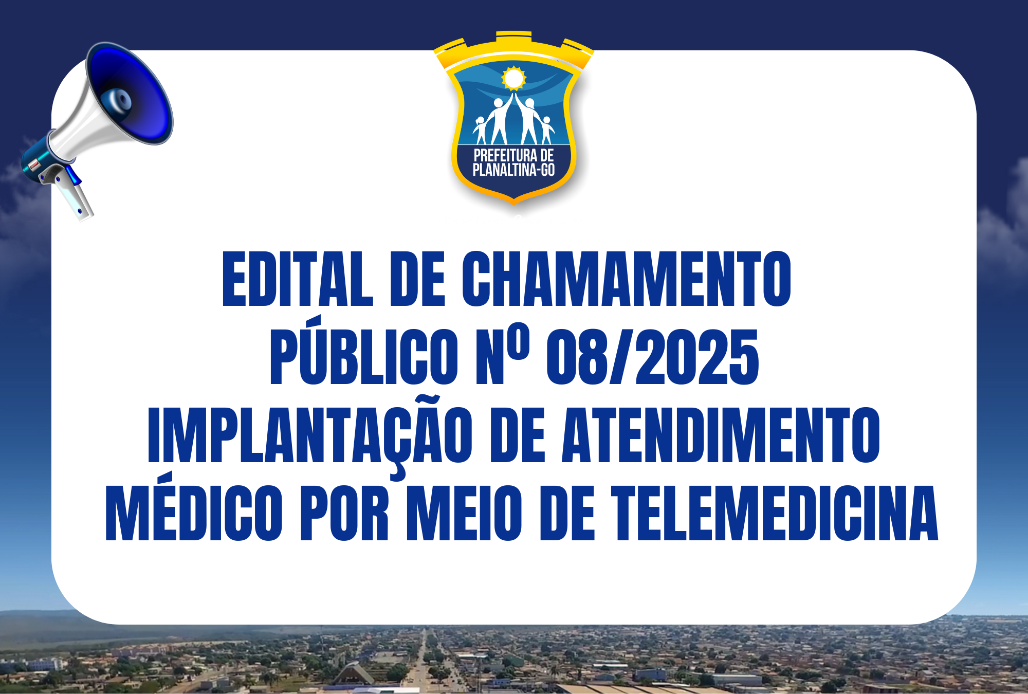 O Município de Planaltina, Estado de Goiás, por intermédio de seu Agente de Contratação e Equipe de Apoio, designados pelo Decreto nº 718, de 10 de janeiro de 2024, em conformidade com a Lei Federal nº 14.133, de 1º de abril de 2021, e suas alterações, torna público para conhecimento de todas as empresas interessadas, nos termos do Art. 79 da referida Lei e do Decreto nº 11.878, de 9 de janeiro de 2024, o Edital de Chamamento Público nº 08/2025, que trata da Implantação de Atendimento Médico por Meio de Telemedicina.