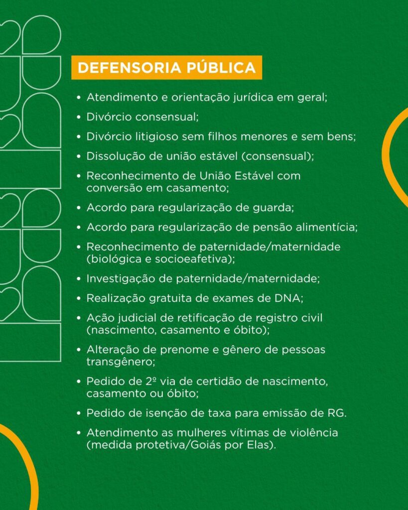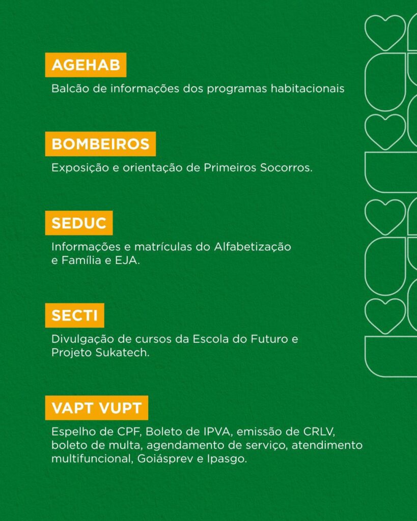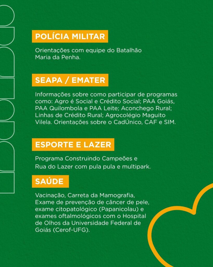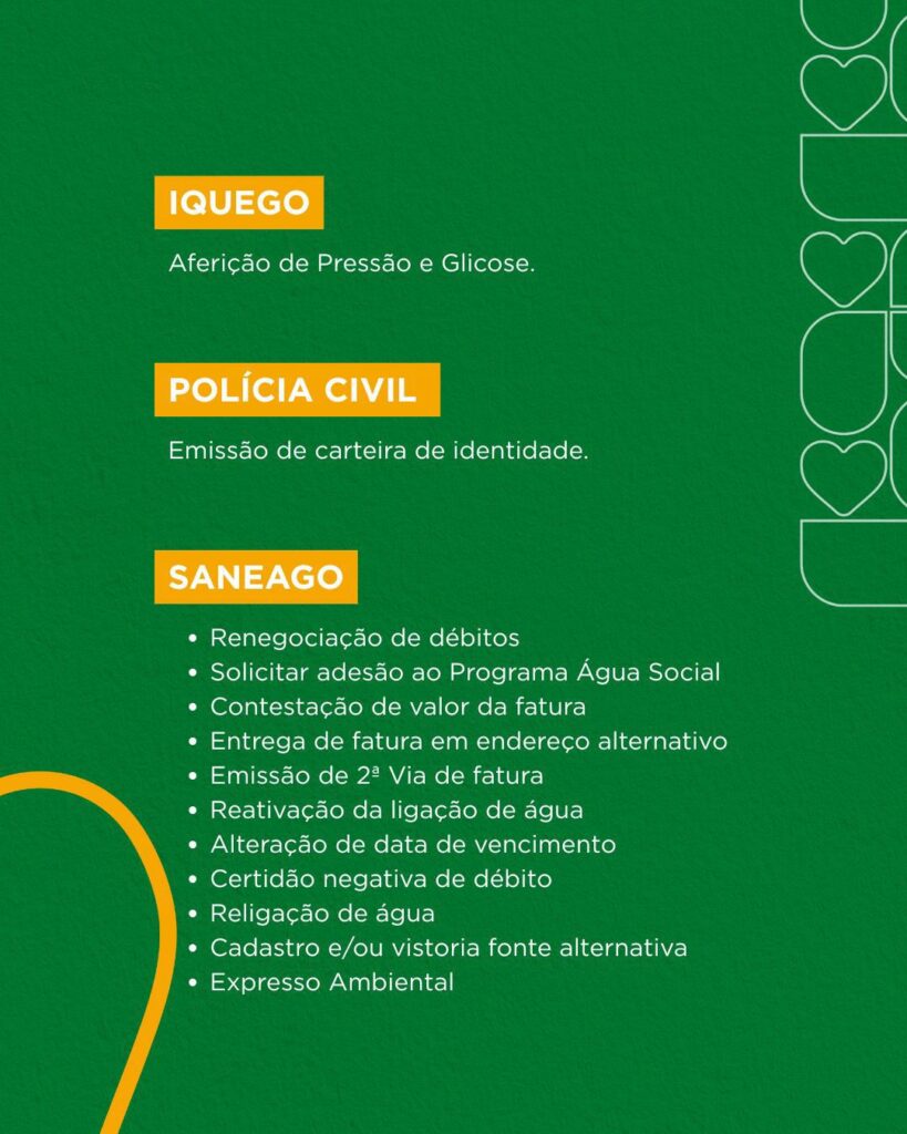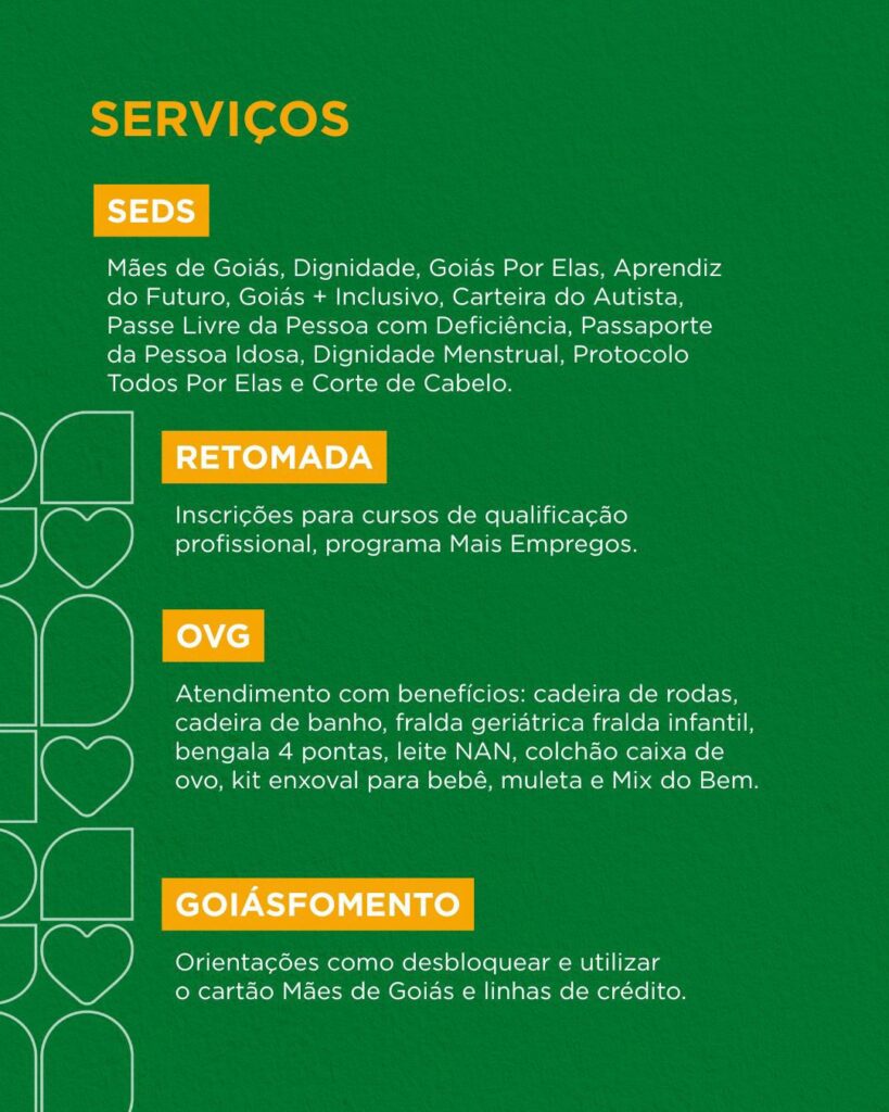 - Serão oferecidos serviços à comunidade e entrega dos benefícios Mães de Goiás, Dignidade e Goiás + Inclusivo