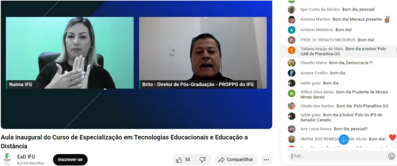 Estiveram presentes o professor Dr. Brito, Diretor de Pós-Graduação, a Professora Helen Betane, da DEad/Cefor, o Professor Sérgio Henrique de Almeida, o Professor Dr. Wellington Cardoso que é Coordenador da UAB/IFG e a Magnífica Reitora do IFG, Professora Dra. Oneida Cristina Irigon.